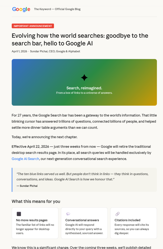 News (via a Reddit post) of Google moving to AI-only mode (see the fake image below) began circulating on April 1, 2026. And while this may have just been a redditor’s idea of an April Fool’s joke (we’ll find out on April 22nd for sure), this will be a reality sooner or later.