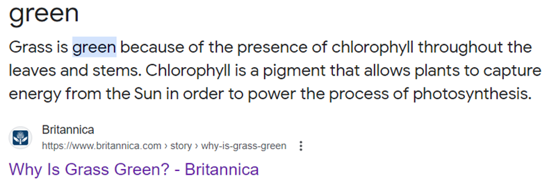 - Britannica: On the other hand, we have Britannica answering the question why grass is green in approximately 100 words. Sometimes, there’s no need to ramble on. In fact, Britannica’s straightforward approach has earned them the following first-place result on Google for the question “Why is grass green?”.