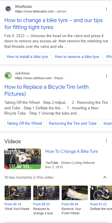 In addition: results may differ for desktop and mobile. So, for the query “how to change a bike tyre” you may see more Youtube videos pop up in search results, as pictured below. In addition, different website may pop up if they’re better optimized for the mobile experience.