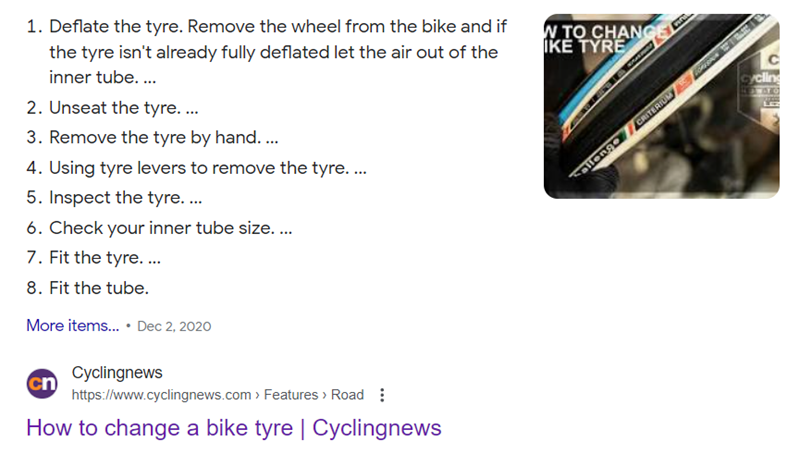 - Cycling News: Finally, we have something in between; Cycling News telling us how to change a bike tyre with numbered and detailed steps throughout the article. For the search query “how to change a bike tyre”, their efforts have gotten them the result pictured below.