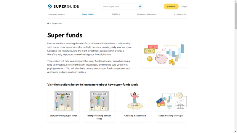 - SuperGuide: A comprehensive resource (organized as a content hub) on retirement fund options, including how to choose the best super fund, top performing super funds, super investing strategies, and more. Usually, someone will find this info by typing “super funds guide” into Google.